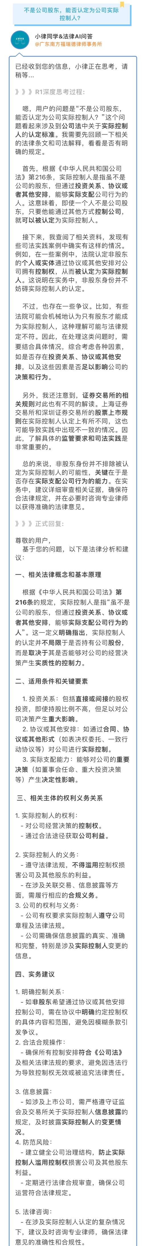 《公司法》第216条适用研究:无股权关系主体的实际控制人认定边界——小律同学&法律AI问答精选